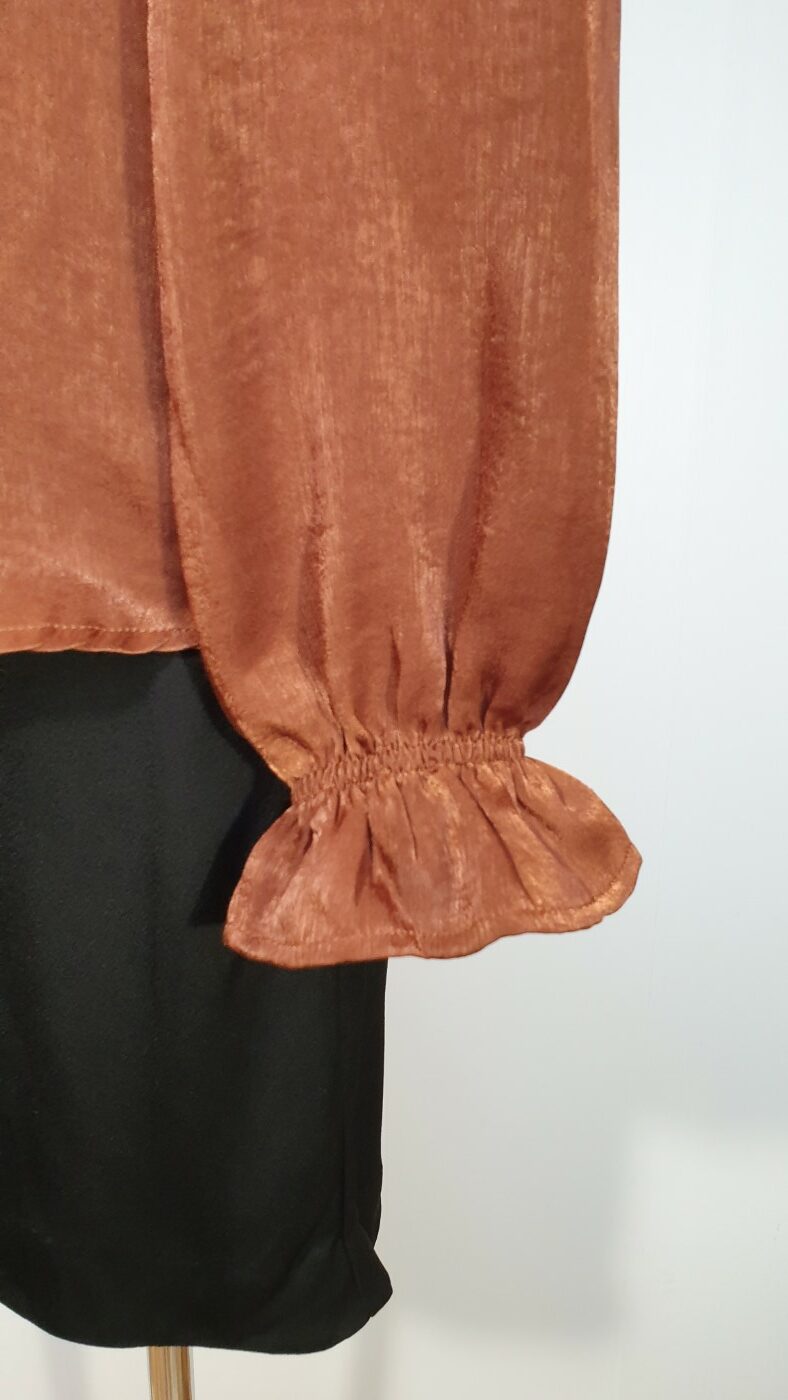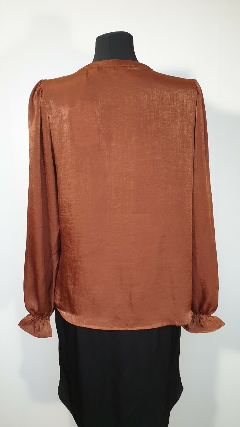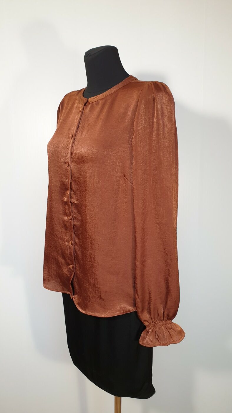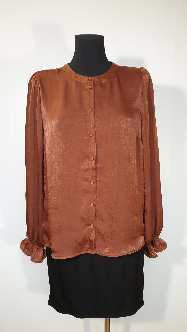 Dāņu zīmola B.Young blūze ar apaļu izgriezumu un garām piedurknēm. Brīva piegriezuma modelis. Plāns, viegls, dabīgs materiāls. Priekšpusē pogu aizdare. Piedurknes ar dekoratīvām malām ar iešūtu gumiju.