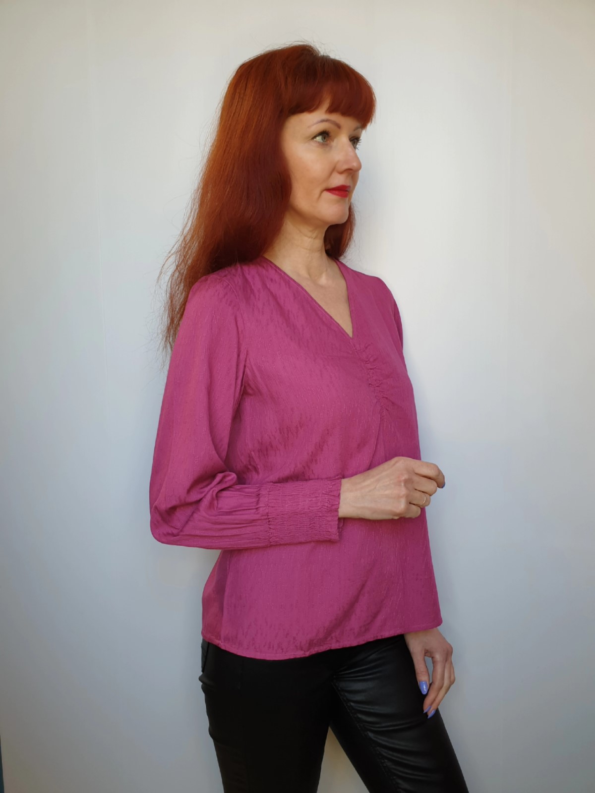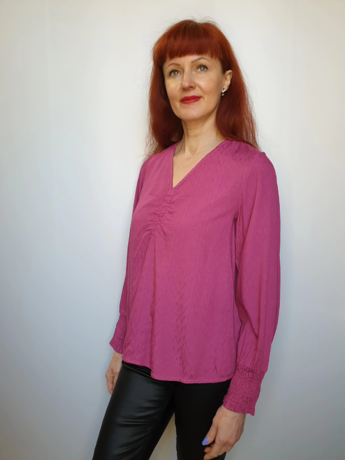 Blūze ar garām piedurknēm no Fransa kolekcijas. Dabīgs, plāns, mīksts materiāls. Brīva piegriezuma modelis. V – veida kakla izgriezums. Piedurkņu gali ar iešūtu gumiju.