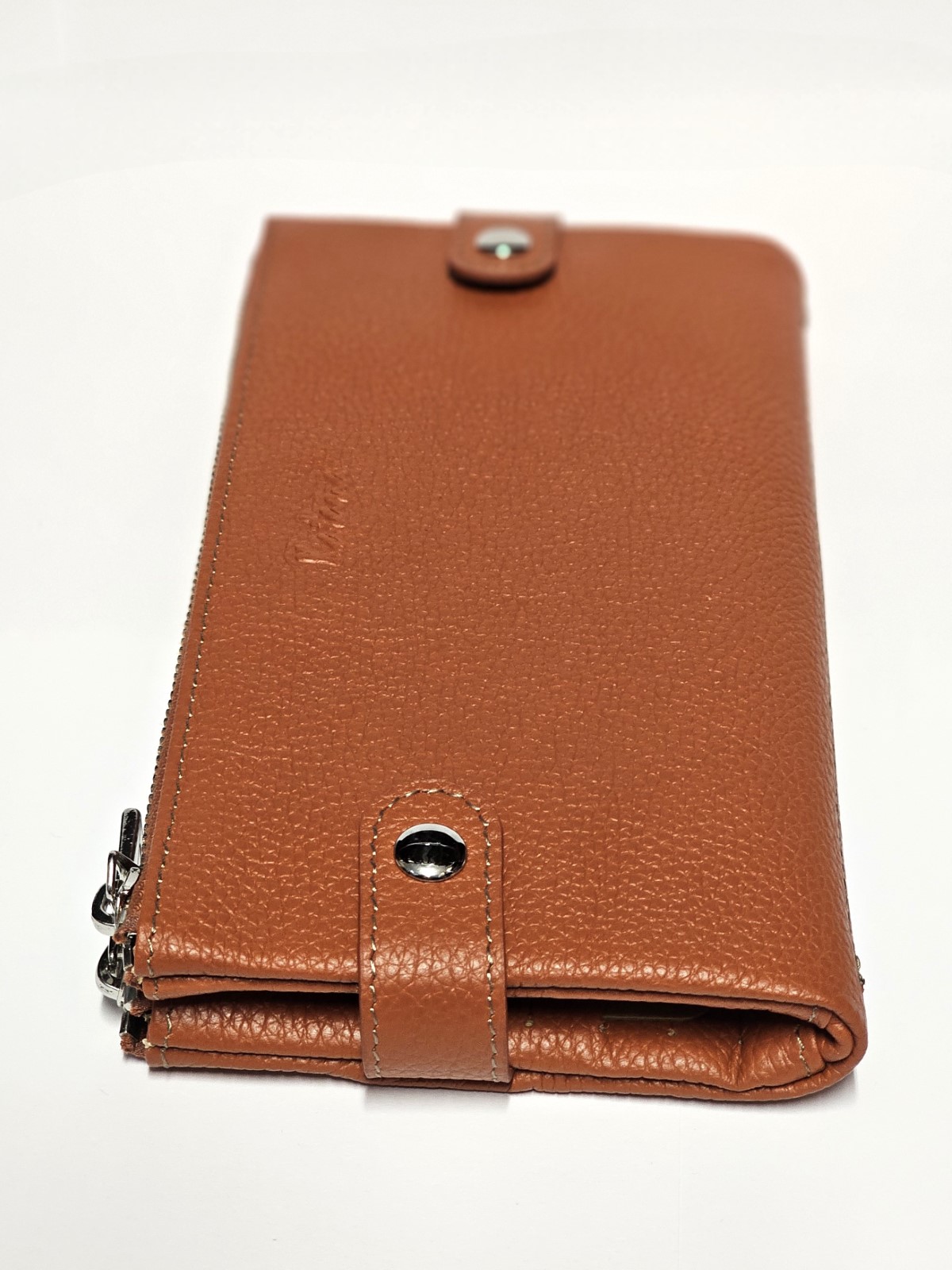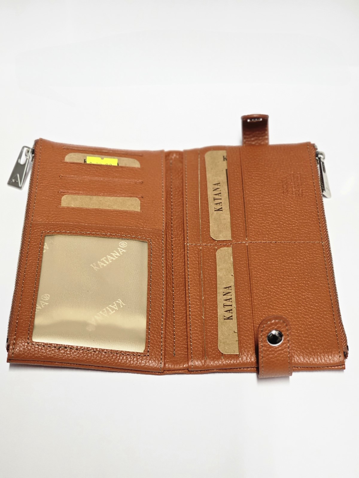 Sieviešu maks no franču zīmola Katana kolekcijas. Dabīga āda. 2 nodalījumi ar rāvējslēdzēja aizdari, 2 nodalījumi papīra naudai, 13 kabatas kredītkartēm. Maka izmērs: 19.5×10×2cm
