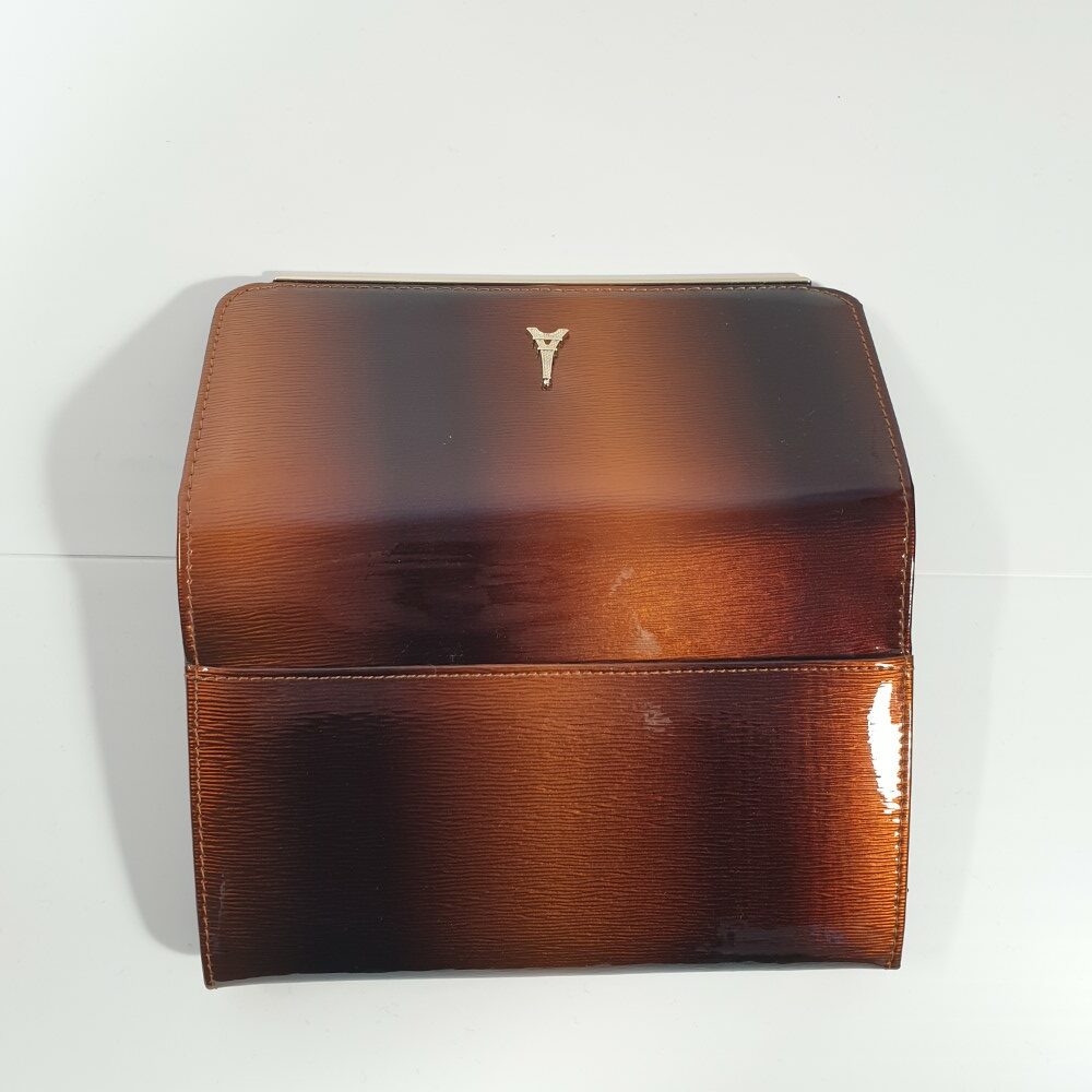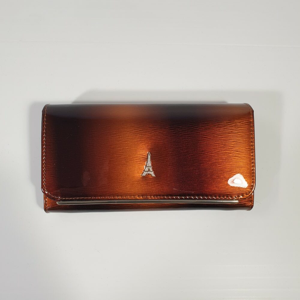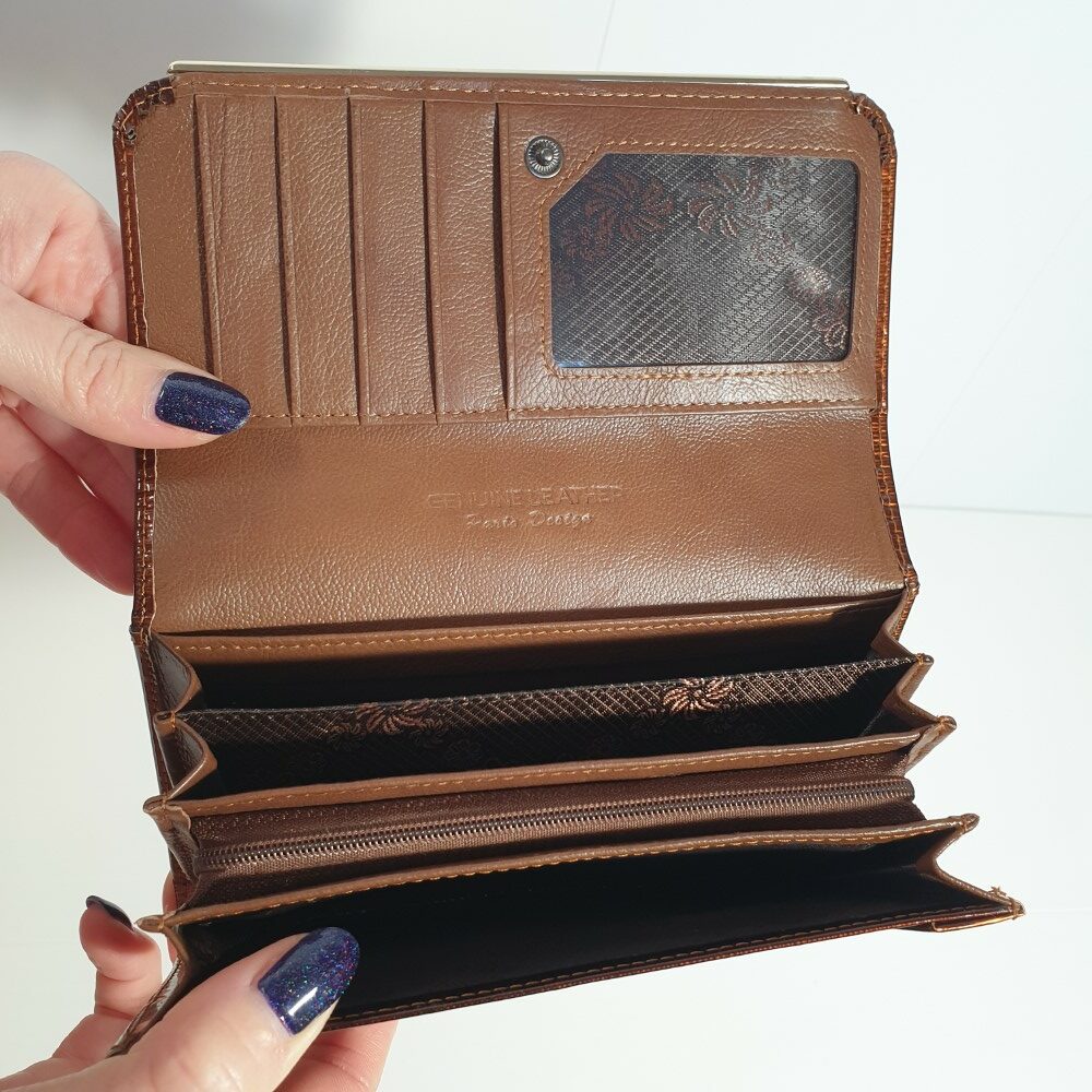Sieviešu maks no dabīgas ādas. 4 nodalījumi papīra naudai, nodalījums monētām, 5 kabatas kredītkartēm. Spiedpogas aizdare. Maka izmērs: 17.2×9.2 cm